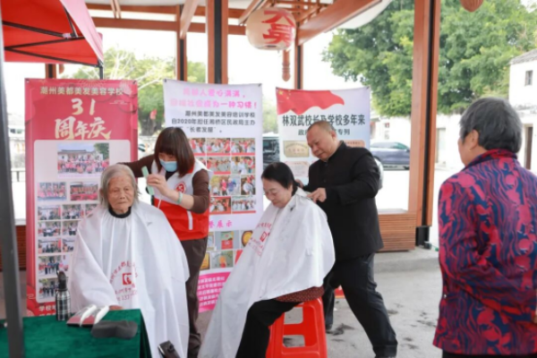 活动现场还活跃着巾帼志愿者的身影,潮州市美都美发美容学校林双武校长带领巾帼志愿者现场提供义剪志愿服务。理发师们手法熟练、耐心细致,为陆续前来的老年人剪出清爽利落的发型,阿姨对着镜子左右照看,脸上漾开了满意的笑容。