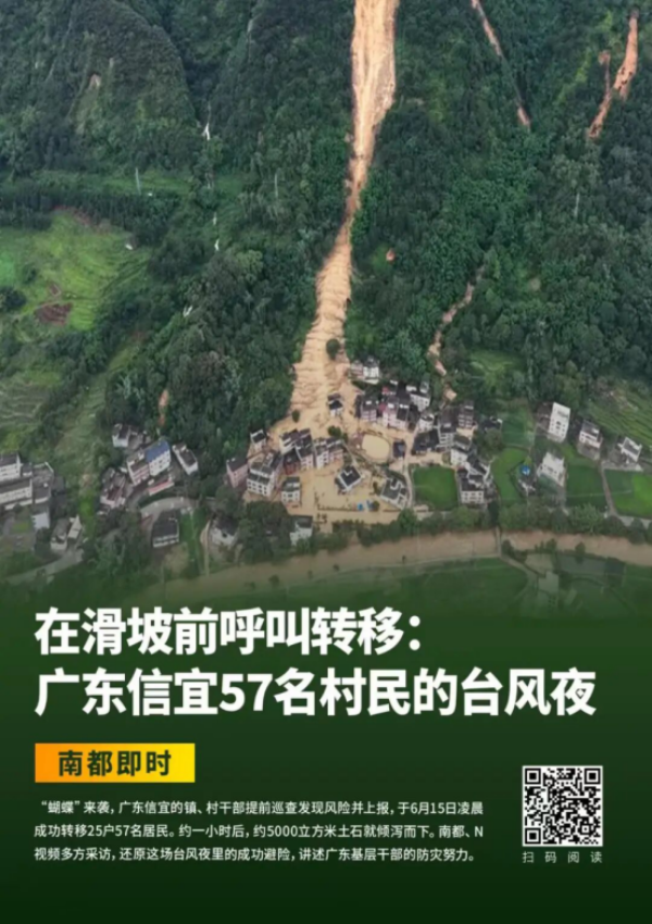 此前报道,2025年6月15日凌晨,受台风“蝴蝶”影响,贵子镇出现强降雨,刘名芳巡查发现联二村水沟涌出大量黄泥水,她惊觉这是山体滑坡的前兆,便立即向镇里上报情况。经过两小时奋战,57名村民全部安全转移,1小时后该区域发生山体滑坡,35间房屋受损,所幸无人员伤亡。